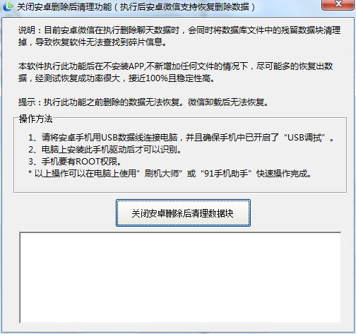 目前安卓微信在执行删除聊天数据后无法恢复。经测试发现在删除数据后会清空掉残留的碎片信息,彻底无法恢复出数据。针对此情况,本软件的此功能用于关闭删除后清空残留的操作,删除数据不受影响,同时不影响恢复碎片数据。